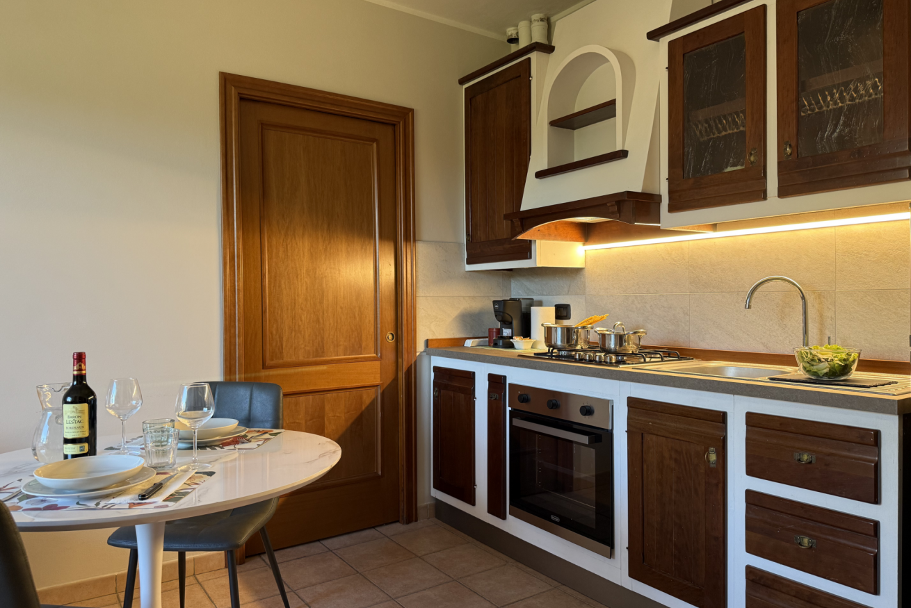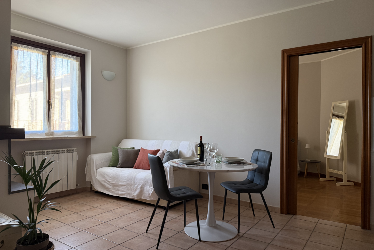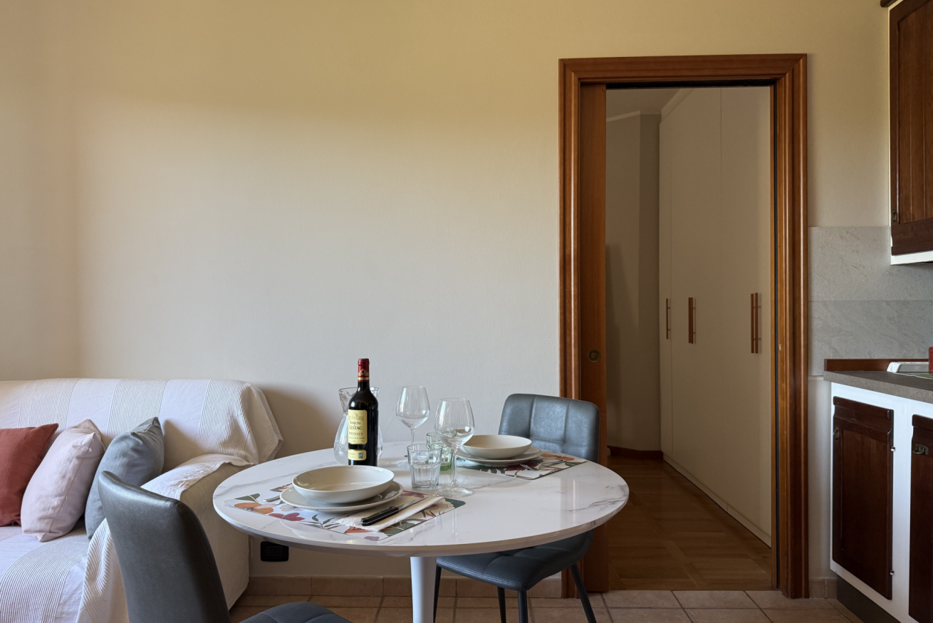 L’alloggio dispone di una luminosa zona giorno open space con cucina completamente attrezzata e salotto, una camera da letto con letto king size e un bagno. Ideale per una coppia o una coppia con un bambino piccolo, combina comfort e praticità in un ambiente curato e rilassante.